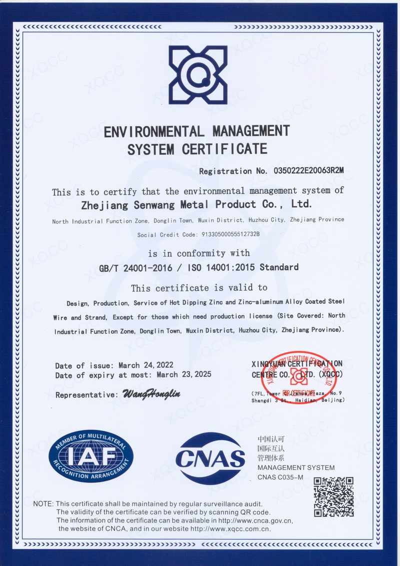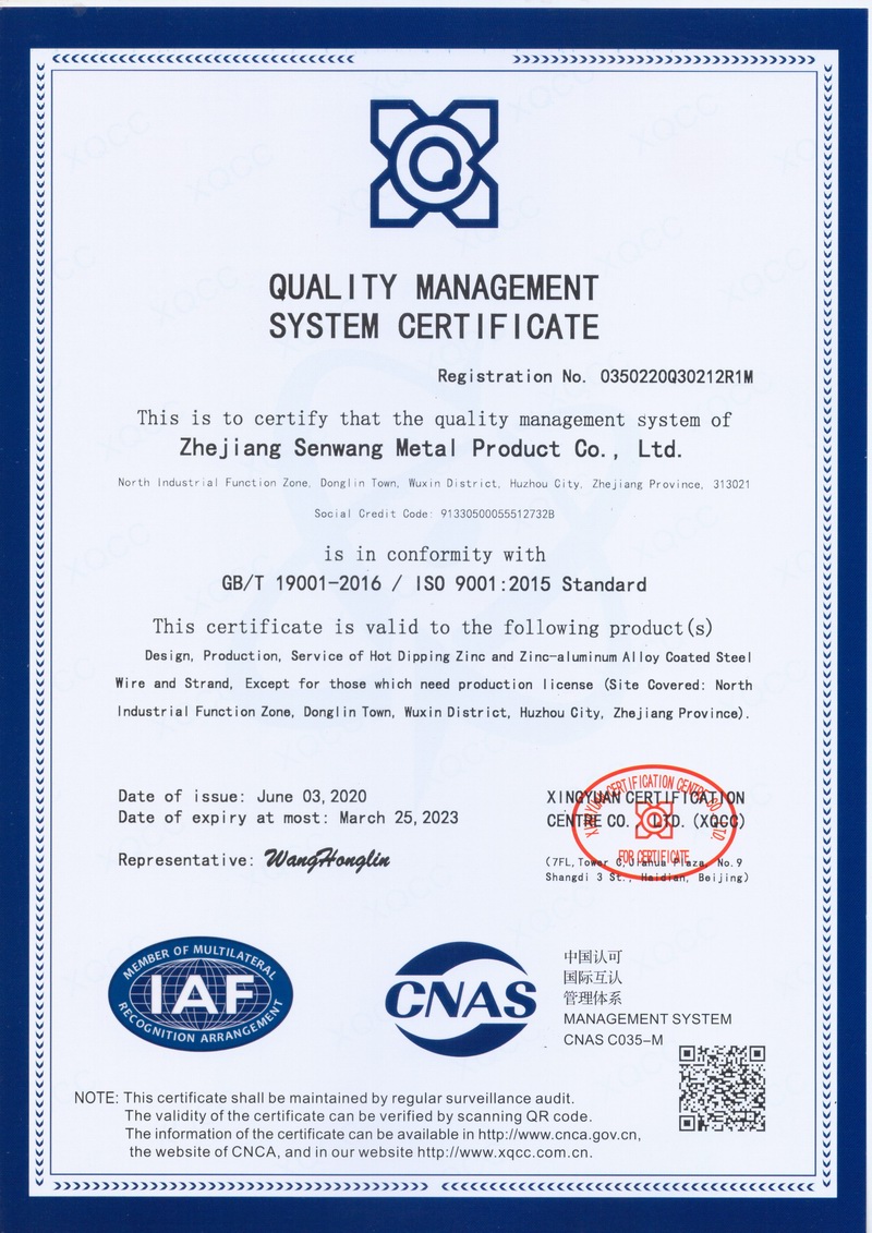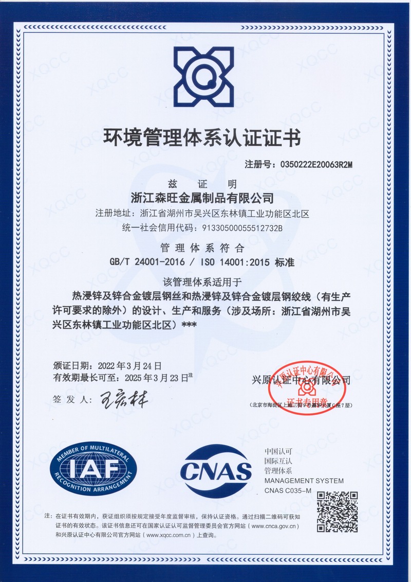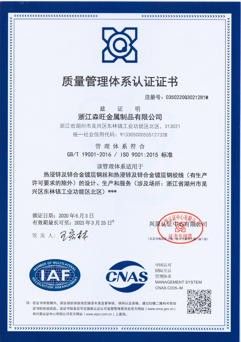 浙江森旺金屬制品有限公司成立于2012年,坐落湖州市吳興區東林鎮工業功能區。公司專業從事各類鍍鋅鋼絲、鋼絞線等產品的開發(fā)及生產。目前產品已廣泛應用于各類通信光電纜,電力輸送,電氣化鐵路工程,各類堤壩防護及農業溫室等工程領域。公司秉承“追求卓越品質,創(chuàng)建卓著信譽”的經營理念,始終堅持專業化、規(guī)模化的經營模式。